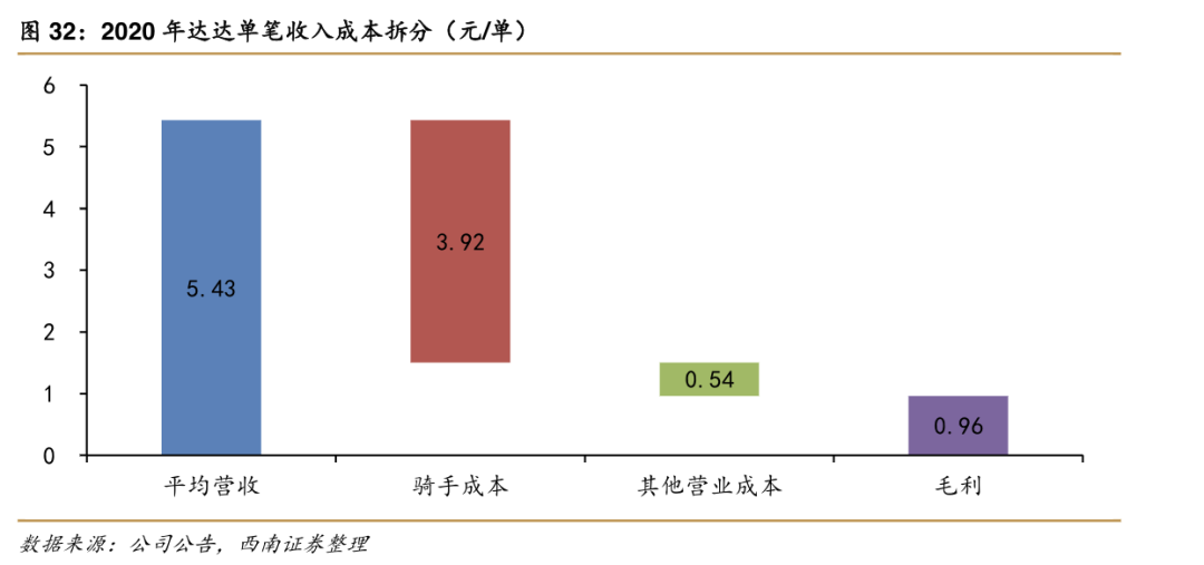 根据西南证券调研,2020年达达每单能赚5.43元,其中支付给骑手3.92元,占比72.3%,单笔毛利为0.96元,毛利率为17.7%。对比快递领域,中通的单票毛利为0.47 元,毛利率23.2%。