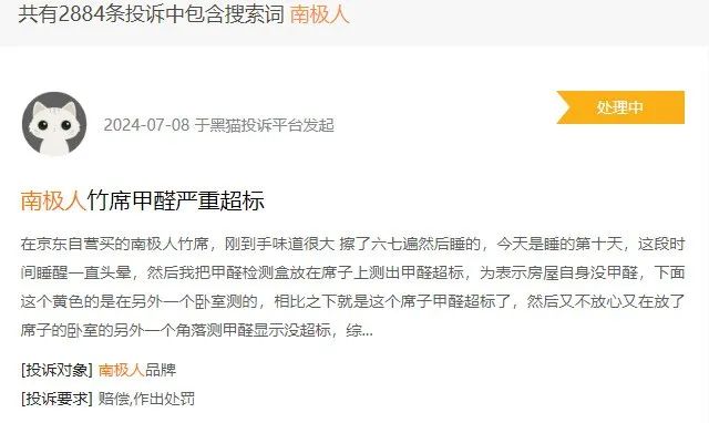 黑猫投诉平台2884条差评里,有人晒出南极人羽绒服跑绒如蒲公英,有人拍视频展示南极人电饭煲煮出夹生饭。