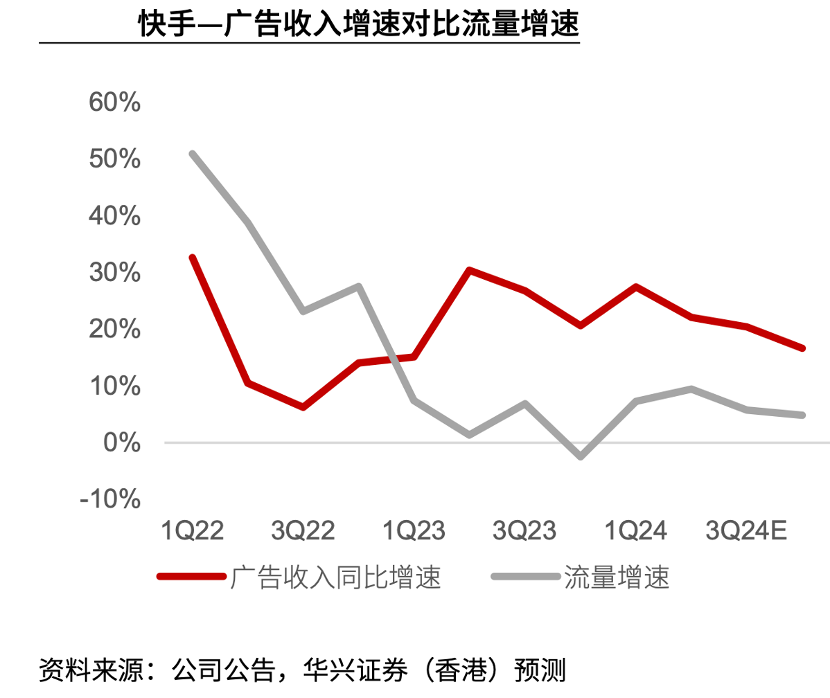 华兴证券曾测算了快手广告收入对比流量增速的情况,2023年之后平台总流量仍然在加速增长中,对比之下广告收入同比增长却在不断下滑中。