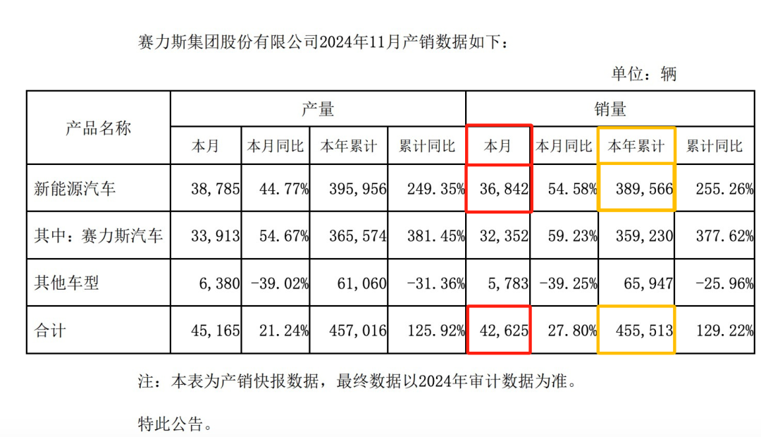 2024年11月合计汽车销量 4.26 万辆,同比增 27.8%,新能源汽车销量 3.68 万辆,同比涨 54.58%;前 11 月汽车销量 45.55 万辆,新能源汽车销量 38.96 万辆,同比增幅超 255%!