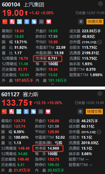 要知道,上汽集团市净率0.75倍,基本处于上市以来最低水平。横向对比,上汽估值亦是中国车企集团中最低,赛力斯市净率14.97倍,处在历史高位。