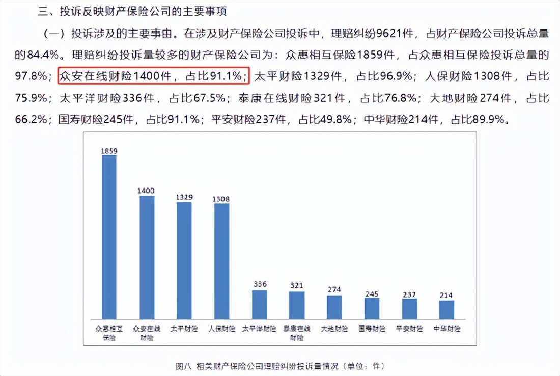 根据国家金融监督管理总局发布的《关于2023年第一季度保险消费投诉情况的通报》,2023年第一季度,在涉及财产保险公司投诉中,理赔纠纷有9621件,占财产保险公司投诉总量的84.4%。其中,众安在线财险相关纠纷1400件,投诉量排名第二位,仅次于众惠相互。