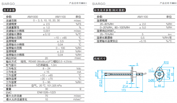 美国Siargo MEMS风速传感器HAVC系统AM1000系列参数: