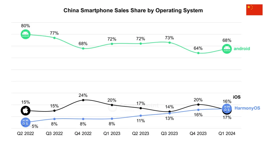 Counterpoint Research发布的《iOS vs Android Quarterly Market Share》调查报告显示,2024年第一季度,HarmonyOS首次超越苹果iOS,坐上了中国智能手机操作系统份额的第二把交椅。