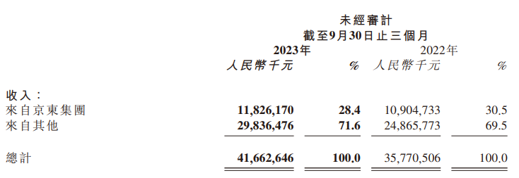 同时,京东物流来自外部客户的收入稳步提升,占总营收超七成,数据显示,今年第三季度,京东物流来自京东集团的收入为118亿元,占比约28%;来自外部客户收入达到298亿元,占比提升至71.6%。