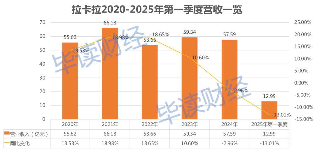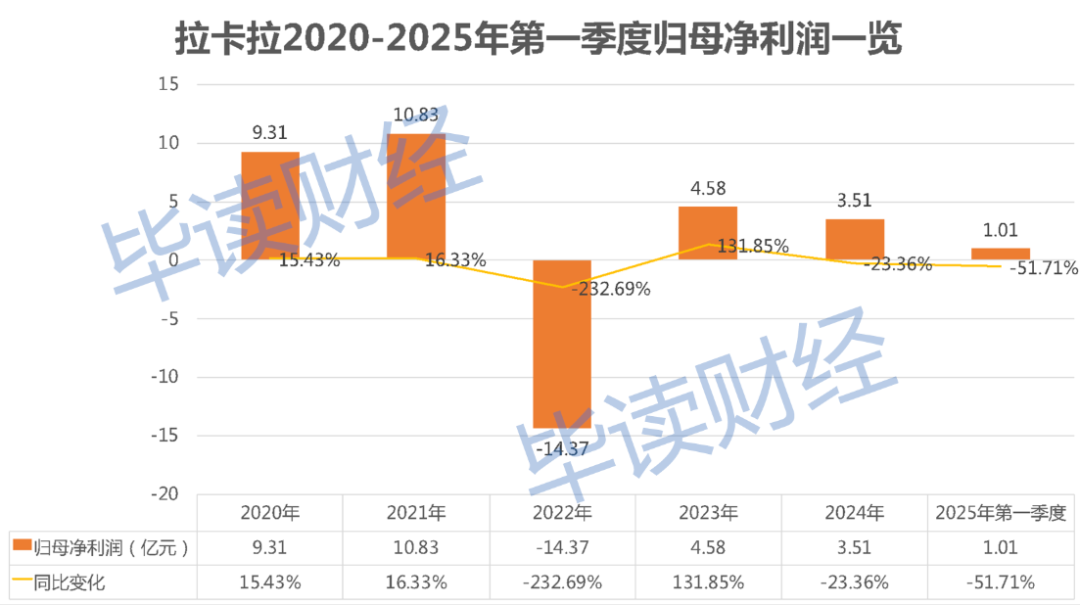 虽然2023年公司短暂扭亏,但进入2024年后,拉卡拉业绩再次下滑,甚至陷入营收、净利润双降的泥潭。当年,公司实现营收57.59亿元,同比下滑2.96%;归母净利润3.51亿元,同比下降23.26%。进入2025年第一季度,情况仍然未有好转,公司实现营业收入12.99亿元,同比下滑13.01%;归母净利润1.01亿元,同比下降幅度高达51.71%。