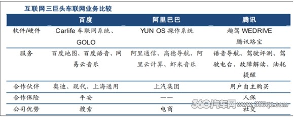 而部分互联网巨头已经意识到了问题的严重性,2014年苹果和谷歌分别构筑了CarPlay、AndroidAuto系统。2015年伊始,BAT便开始在车联网上发力,以阿里巴巴为代表也同时展开了与整车厂的合作模式。