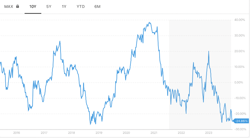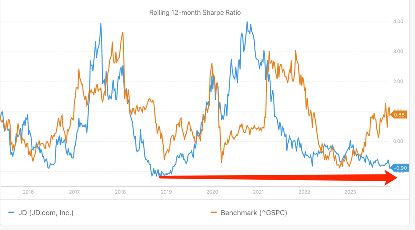 上图为京东夏普比率的走势情况(基准为标普500指数),我们可以非常确切看到当前京东的夏普比率不仅低于大盘标普500,且数值跌破0,此情况已经十分接近2018年股价暴跌时候的情况,市场此时用钞票做投票,对京东投资采取十分审慎态度。
