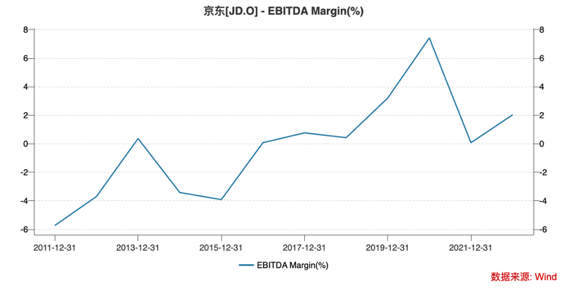 2021年以来,京东的EBITDA利润率(息税折旧前利润)便急转直下,从巅峰时候接近8%,跌到不足2%。