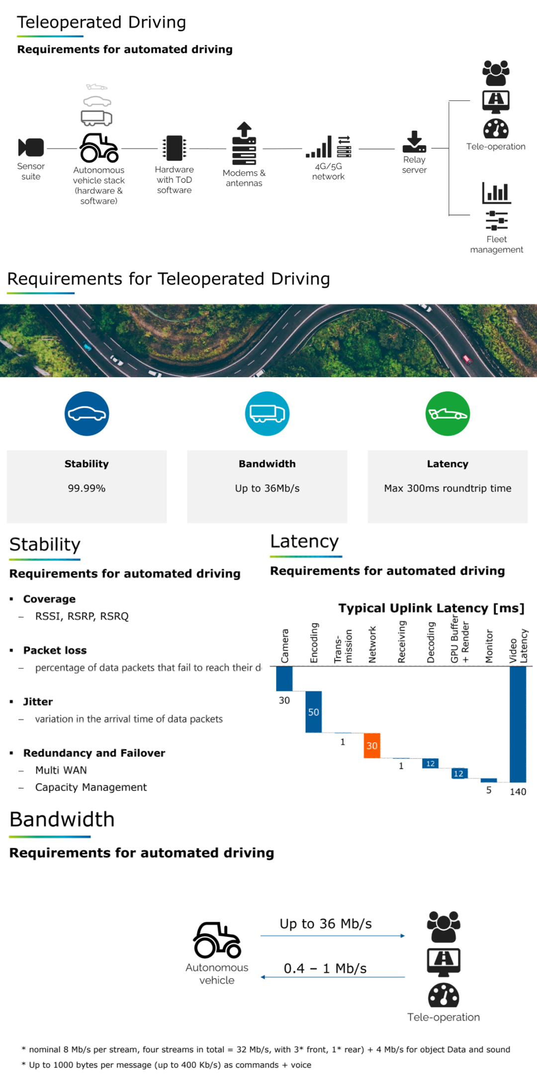 以远程操控(Teleoperated Driving)为例,从车载传感器采集信息并回传到操作中心,同时接收控制指令回传至车辆,整套流程对通信延迟的要求极其苛刻(通常不得超过300ms往返延迟)。