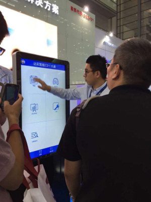 达实销售人员为观展嘉宾演示达实智能C3一卡通系统的考勤、门禁、会议管理、消防查询等精细化应用