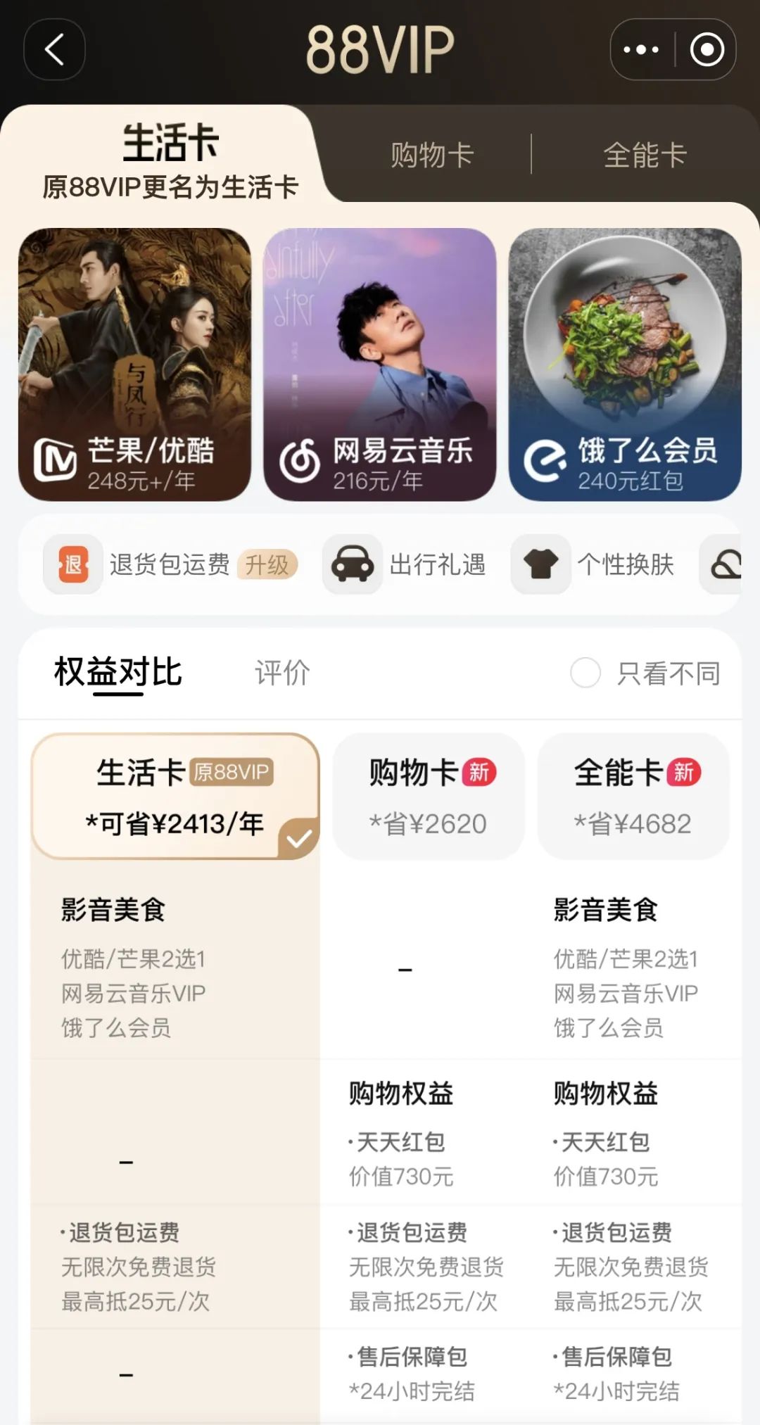 去年双 11 大促前夕,淘宝就升级过一次 88VIP ,包括原有权益和价格不变,更名为“生活卡”,新增“购物卡”和“全能卡”,主打天天红包、退货运费包、售后保障包的电商购物“新三包”权益。今年 4 月 22 日,又增加了无限次“退货包运费”权益。