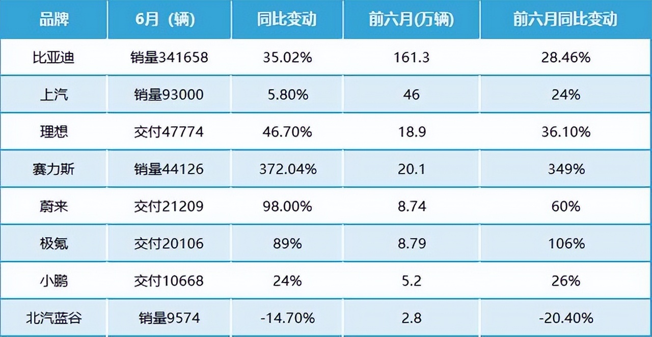 7月1日,多家车企公布6月销量,比亚迪仍旧一骑绝尘,连续第四个月销量超30万辆,赛力斯销量首度“破四”达到4万余辆,极氪品牌首次单月交付破2万台,蔚来汽车交付量更是实现翻番增长,创历史新高。