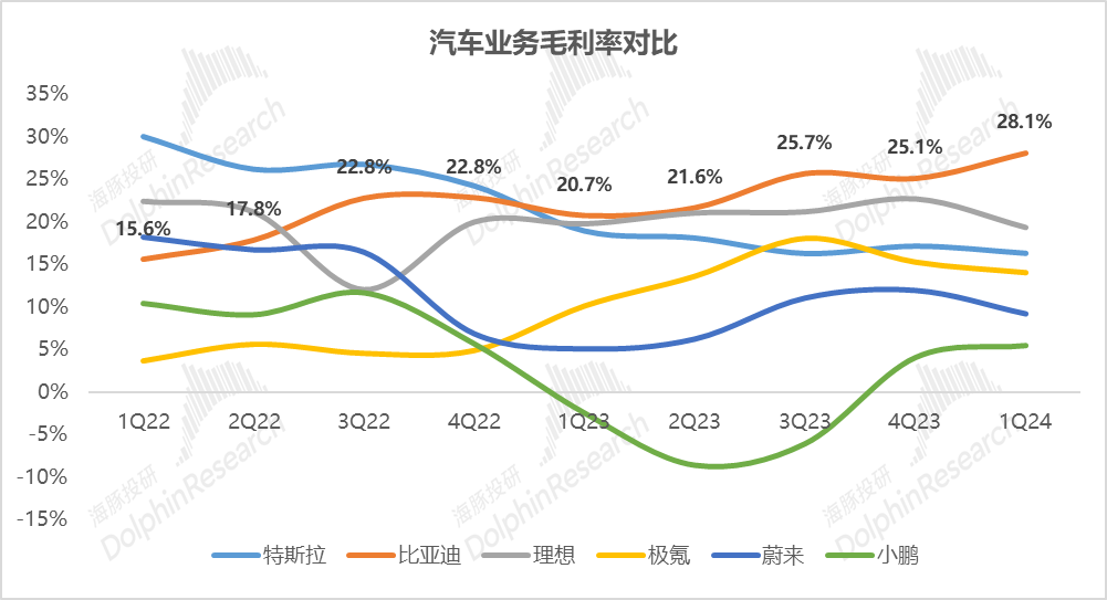 同为龙头,在新能源车竞争激烈单价下行的趋势下,为何比亚迪的造车业务毛利率走出了截然不同的趋势?
