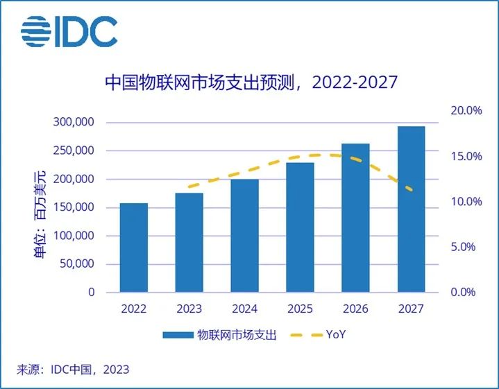 与此同时,我国将会成为全球最大物联网市场,未来五年将保持平稳向好态势。IDC预测,2026年中国物联网IT支出规模接近3000亿美元。