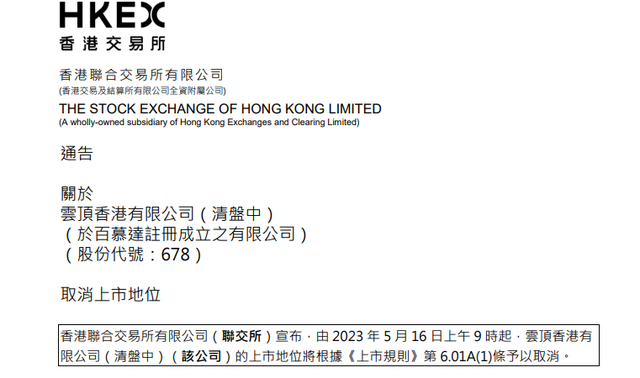 5月11日,港交所宣布,自2023年5月16日上午9时起,云顶香港(00678.HK)的上市地位将根据《上市规则》第6.01A(1)条予以取消。