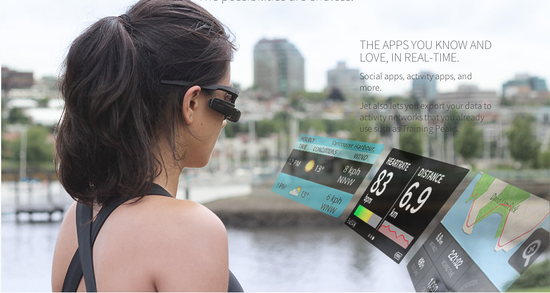 当别人看到你这样的装扮时可能会哭笑不得,但是这家新收购的英特尔子公司Recon Jet,可能会是眼镜穿戴智能化,现在和未来趋势领航者。你带着这幅智能眼镜,不仅不会影响你的视界,让你分心,还可以直观看到你的运动数据和外界数据。非常直观的,Jet内置有全球定位系统,相机和地图,以及三维加速度计,陀螺仪,和高度表以及蓝牙和蚂蚁+传感器的能力。想象一下,你可以通过敲击镜架,就能转化到心率、速度、节奏或间隔拍摄图片和视频功能,多么的炫酷。连接手机,你可以实现控制音乐播放,接听电话等功能。