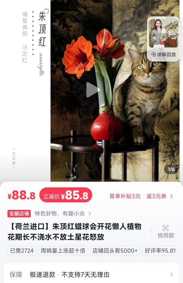 同时,抖音电商平台的一些鲜花,还有着外国血统。 比如,作为花本家的招牌产品,荷兰进口的朱顶红腊球,一支售价 88.8 元 ,已售接近 3000 支; 喜欢玩梗的小伙伴请注意,花的品种真的来自荷兰,而不是中国河南。