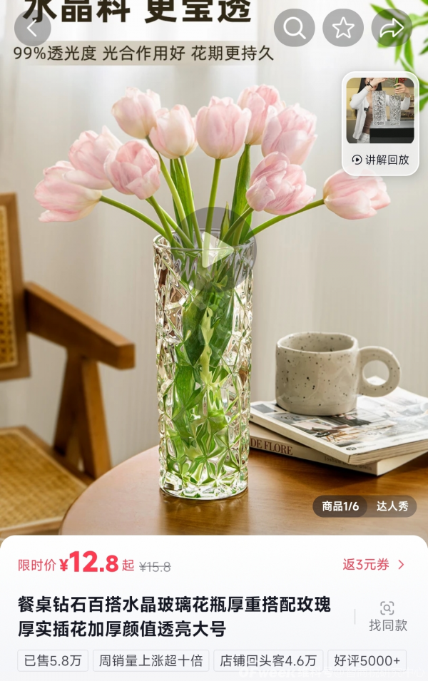 潘哥发现,抖音颐凡鲜花旗舰店,销量最好的一款花瓶,限时优惠价12.8元,已售超过5.8万,其中超过4000人回购。