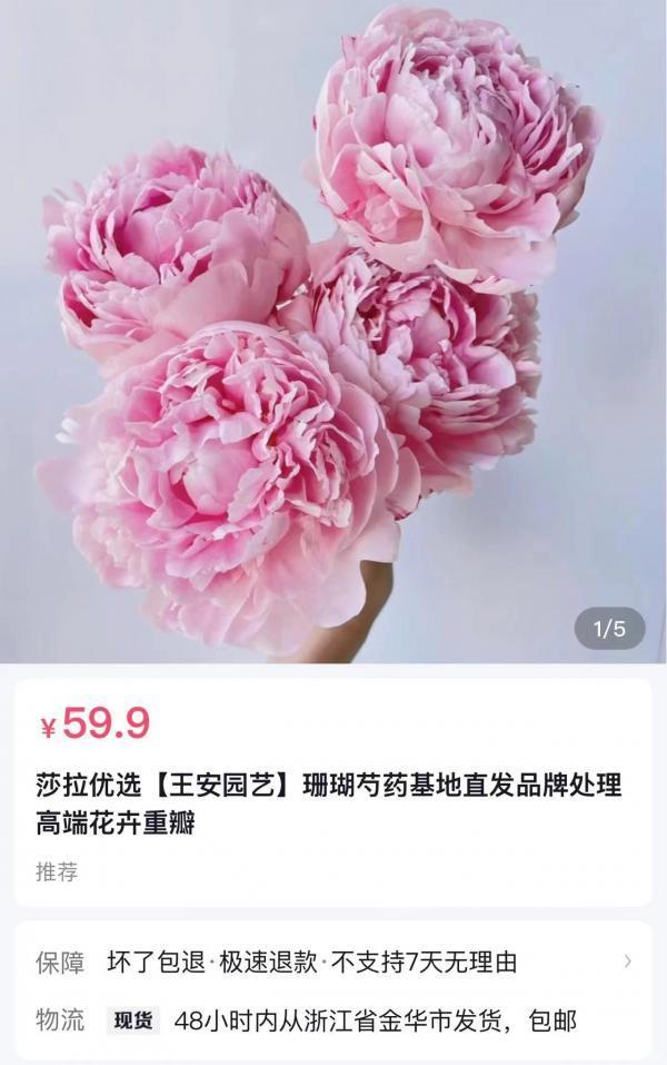 比如,抖音上的进口珊瑚芍药,顺丰包邮空运送达,10支一捧售价59.9元。
