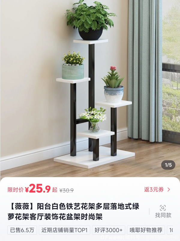 同样在抖音电商平台,一款白色多层铁艺花架,售价25.9元起,已售超过6.5万,成为店铺的销量冠军。