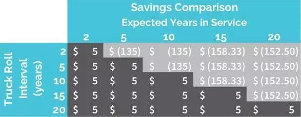 第一眼看的时候,这似乎并不是一个划算的投资。不过,我们要将设备技术的寿命考虑进去的话,这一数字一般是从2年到20年。在这个例子中,设备需要一个上门服务,其寿命包含了各种条件下的不同变化,上门服务一般比较贵,且常被视作隐性成本。因技术的进步,上门服务的成本要包括更换电池和更换无线模块。预期服务年限代表了设备可以正常运转的时间,这个时间当然需要上门服务。上门服务很多时候由服务供应商来提供,一次上门服务成本约为350美元。