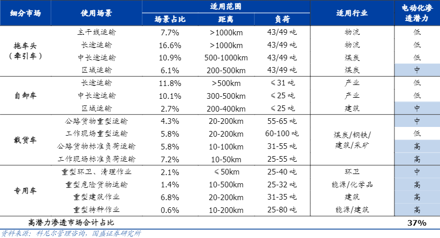 据高工产业研究院(GGII)发布的统计显示,2024年上半年新能源重卡实现销量2.8万台,市场渗透率为12.29%。而国盛证券认为,在政策端持续鼓励下,电动重卡中高渗透潜力应用市场占整体市场的37%,新能源重卡销量有望进一步提升。