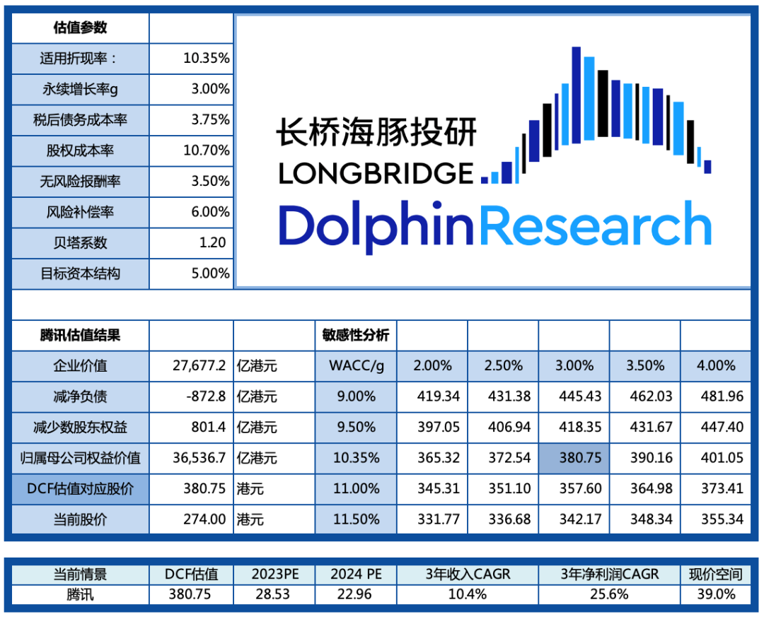 在DCF模型下,按照WACC=10.35%,g=3%的假设条件,计算出腾讯的中性估值近3.6万亿港元,合,对应2023年对应归母净利润为28x PE,对应Non-IFRS归母净利润为24x PE,位于历史估值中枢水平。