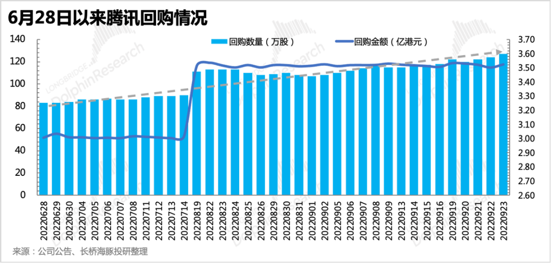 在大股东减持期间,为了支撑股价,腾讯的管理层也在同步回购自己的股份。过去三个月腾讯每日回购额在3~3.5亿港元之间,对应股份数量在83~130万股区间。