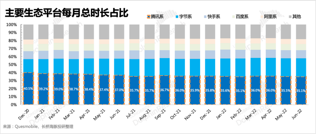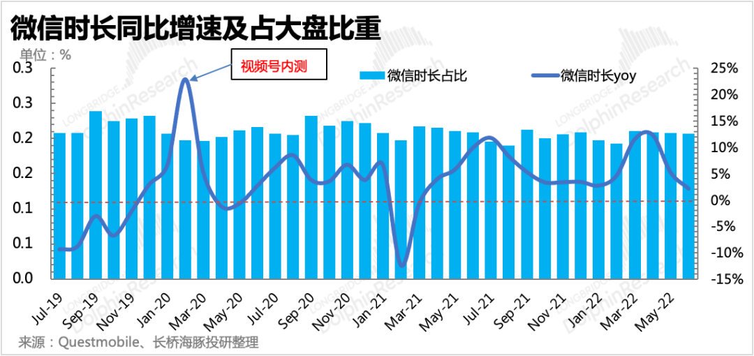 另一方面随着今年年中视频号的日活超越抖音(8.13亿vs 6.8亿,来源Questmobile),微信时长自视频号上线后总时长扭转负增长趋势,及微信时长占比基本保持稳定,未来我们有望看到腾讯生态流量能够进一步趋稳甚至重新修复。