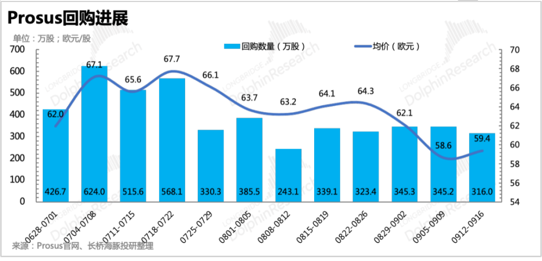截至9月16日,Prosus共计回购0.48亿股,占此次最大回购份额2.65亿股的18%,耗用约31亿美元,合243亿港元。如果按照腾讯在6月27日至9月23日的区间成交均价323港元来计算,减持7600万股,共计245亿港元,剔除掉部分汇率波动影响,基本与Prosus回购金额相等。