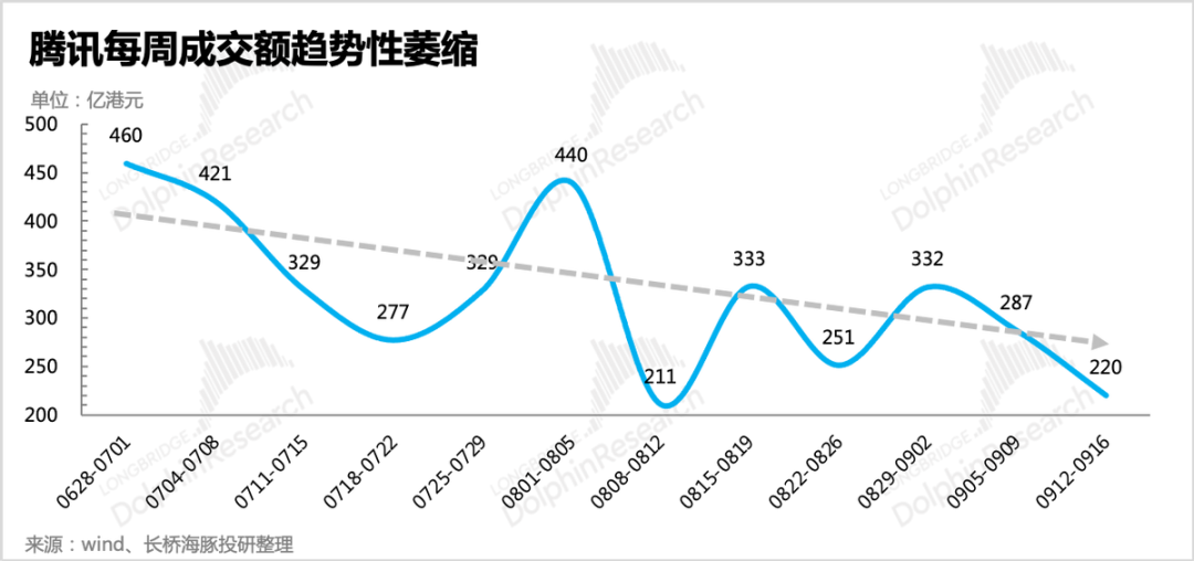 截至9月16日,腾讯已累计回购3281万股,耗用资金106.5亿港元。但与大股东减持的7600万股相比,差距不小。由于股价再破新低,从趋势上来看,尽管市场成交额在下降,但管理层的回购力度在逐渐加大。