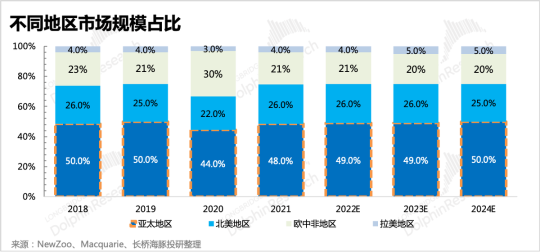 4)不同国家地区市场,拉美、亚太地区未来三年增速相对较高,其中亚太地区的市场规模占了全球的50%。消费习惯、人文环境更相似的亚太市场,也是中国游戏厂商更容易出海的主要市场。