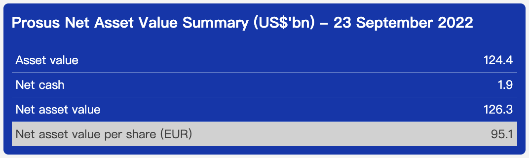 是的,全球股市承压,南非大股东的市值也跌到净资产价值以下了——9月23日Prosus的NAV为95.1欧元/股,当天收盘价53.4欧元/股,折价率为43.8%。相较于减持前一个交易日6月24日的折价率54%下降了近10%。