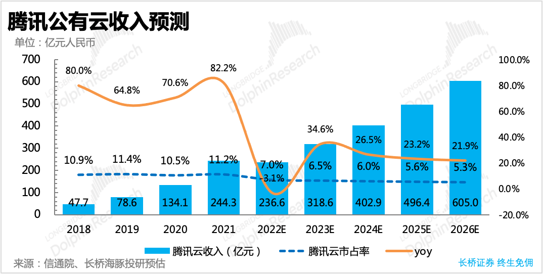 如下图,海豚君预计长期下腾讯公有云市占率将由2021年的11%降至5.5%,但同时随着腾讯云产品更多的以毛利率较高的Paas、Saas服务为主,整体腾讯云的毛利率会相比现在快速提高。