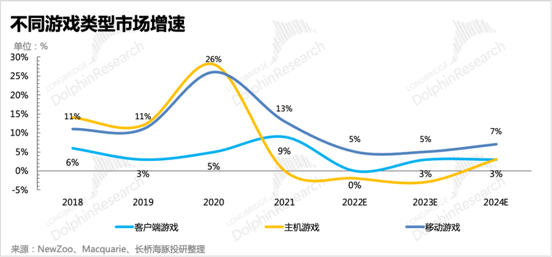 3)不同游戏类型中,移动游戏仍然是增速最高的。这对于擅长移动游戏的中国游戏厂商走出国门来说,是一个相对利好。