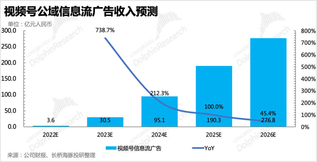 相比于成熟平台抖音和快手,视频号的魅力自然来源于它背后的微信生态,一个中国最大的私域流量平台,也是商家认为长期运营成本最低的流量获取平台。如果不考虑完善视频号之后对腾讯的直播电商可能激起的水花,那么投放在视频号上的公域信息流广告,我们预计能够在中长期2025年达到近200亿的规模,分给视频号的这些预算可能主要来源于从抖音、快手虎口夺食。