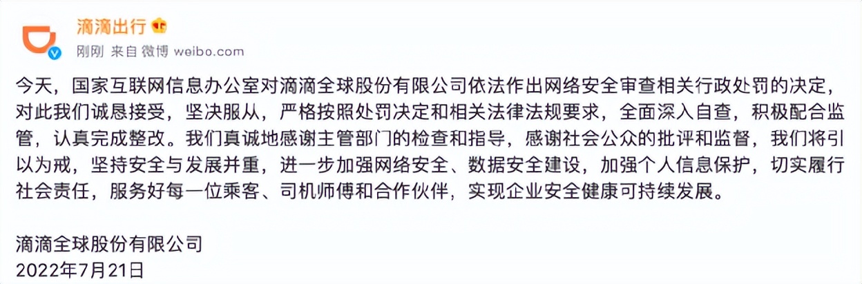 滴滴出行也第一时间发文称:诚恳接受,坚决服从,全面深入自查,积极配合,认真整改。
