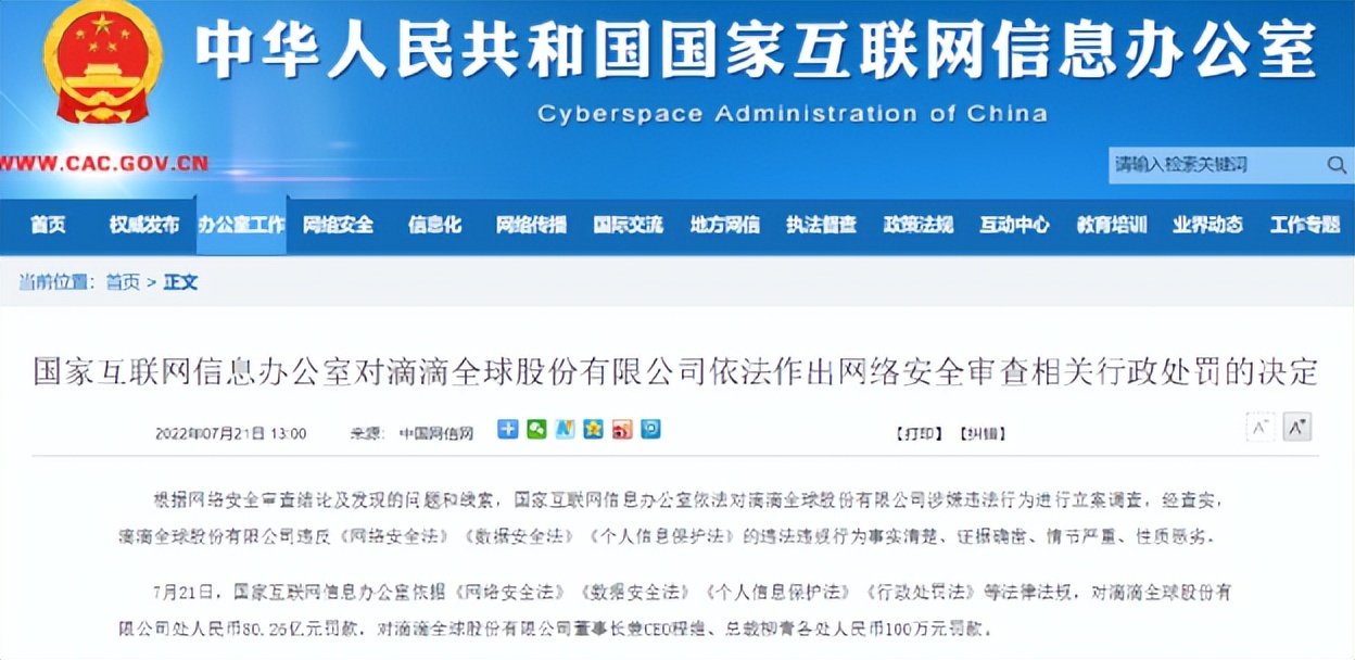 7月21日,对滴滴的重磅处罚落地:国家互联网信息办公室依据《网络安全法》、《数据安全法》、《个人信息保护法》、《行政处罚法》等法律法规,对滴滴全球股份有限公司(下称“滴滴公司”)处人民币80.26亿元罚款,对滴滴公司董事长兼CEO程维、总裁柳青各处人民币100万元罚款。
