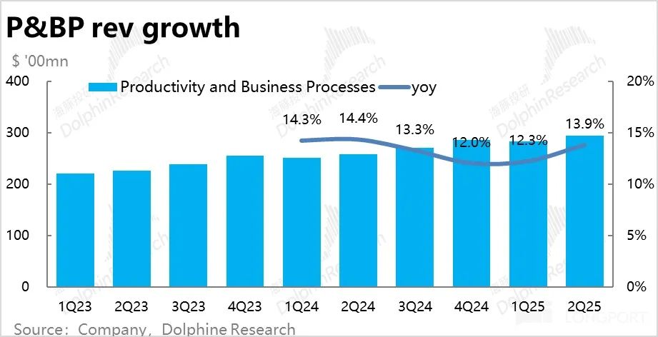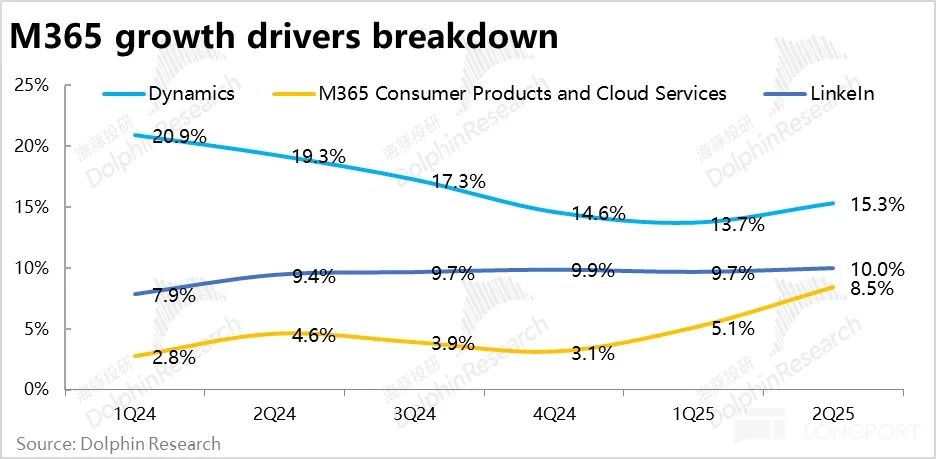 生产力板块中的其他主要业务中,个人 365 业务、Dynamics 业务的增速在本季度都有明显的提升。从生产力流程板块中,除 LinkedIn(与广告相关)其他大部分应用类业务的增长都有改善势头看,一个可能的解释是,在应用和 SaaS 方向上,AI 功能已开始起到拉动需求回升,或者单客户付费金额的走高的效果。