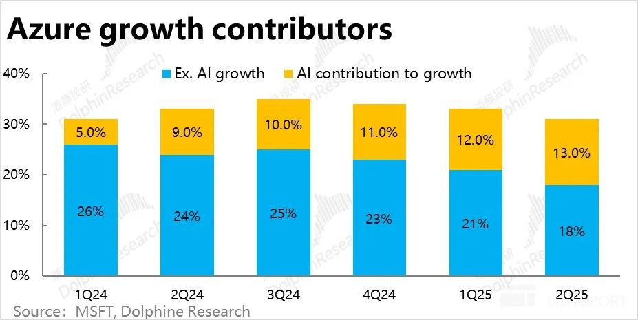 2、本季度 Azure 31% 的增长中,约 13pct 是来自 AI 相关业务,贡献比例相比上季继续小幅上升 1pct,符合市场的预期。但传统非 AI 业务的增长贡献则大幅下降了 3pct,连续 3 个季度下跌且幅度在扩大,可见非 AI 业务的疲软是 Azure 整体表现不佳的元凶。