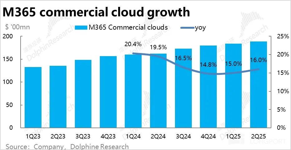 与 AI 紧密度第二高,且口径调整后营收体量占公司整体同样前二的企业微软 365 业务(Microsoft 365 commercial)本季收入增长 16%(恒定汇率下增长 15%),较上季度小幅提速 1pct。相比公司先前指引不变汇率下 14% 的增速也高出 1pct。