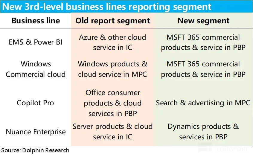 上季度财报后,微软官宣了将在 25 财年开始对财报披露的部门结构做出不小的调整,调整的思路就是把面向企业的微软 365 服务项目(除 to B 的 office 365 之外,还有 windows 365 和网络安全 365)全部调到了以 Office 365 的生产力与流程的收入大项当中(PBP)。在上次业绩点评中,我们已有解读,就不再重复浪费笔墨。下图简要概括了此次的调整,供大家参考。