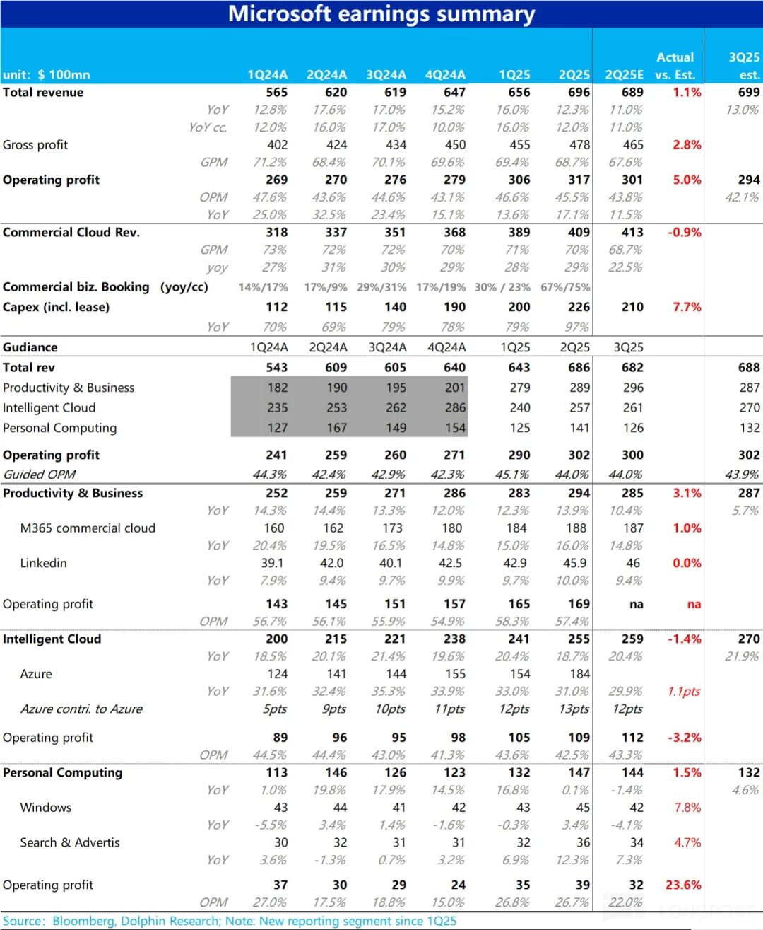 费用角度,除了研发费用大体和营收增长同频,不算吝啬外,营销费用和管理费用分仅别同比增长了 3% 和-8%,明显低于营收增速。无论是出于 AI 带来的增效,或是公司出于对冲 AI 大量 capex 投入的需求,主动裁员&控费的选择,结果是通过在营销和管理费用上的管控,挤出了约 1.6pct 的额外经营利润率。使得本季度微软整体经营利润$317 亿,高出预期的 301 亿约 5%。