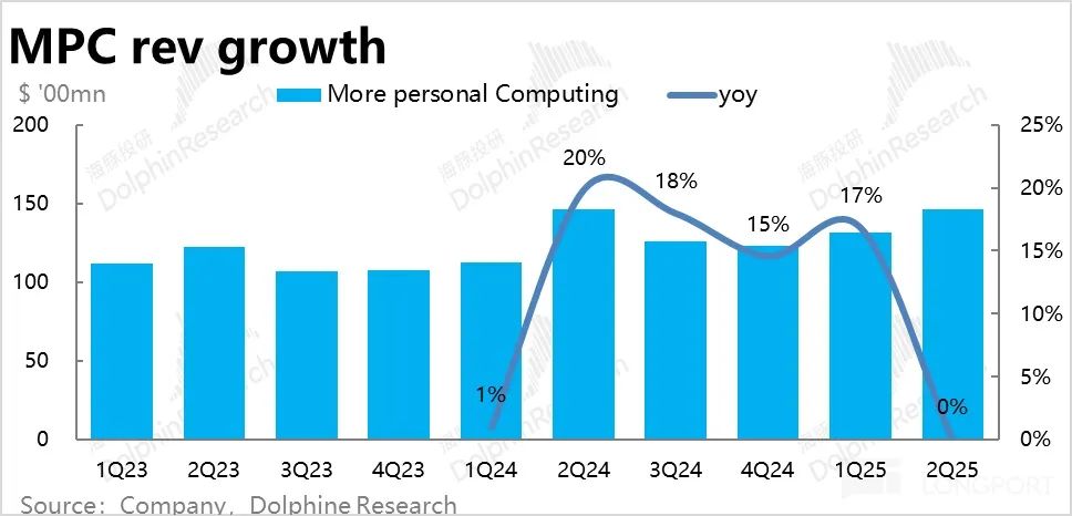 在度过了上个财年 2Q 并表动视暴雪的影响期后,更多个人计算板块的本季度营收同比增速回落到了 0%–并表前的低增长区间上。不过相比更低的市场预期增速(-1.4%),零增长的实际表现并非预期外的坏消息。