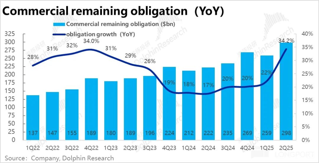类似的,待履约企业合同余额本季也环比大增了约$390 亿,达到$2980 亿,同比增长 34%,同样创疫情以来的最高值。据公司在报告中的披露,新增订单金额的暴涨,主要贡献是来自 OpenAI 的大额订单。