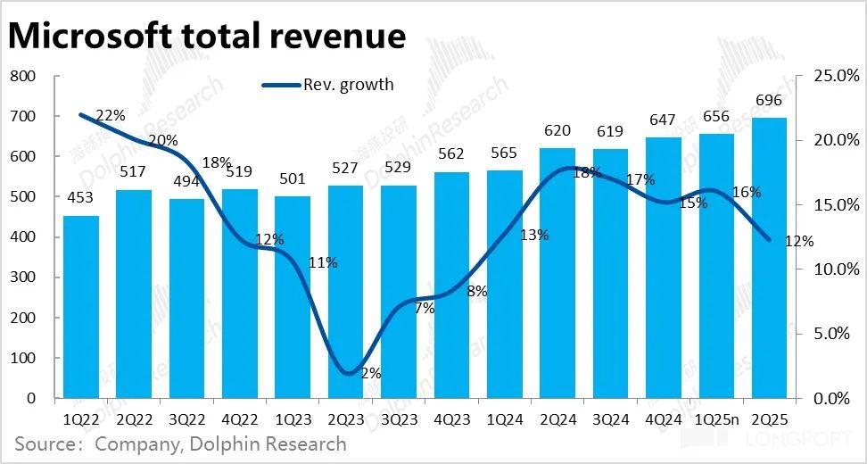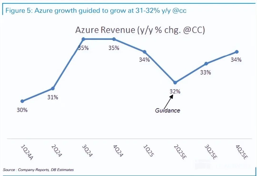 但现实是除了当季表现没有惊喜且跑输买方预期,更大的问题是Azure 下季度增速的指引区间依旧是 31%~32% 和上季度区间完全相同,并没有提速。如果说仅是本季增速稍低于预期,市场仍可自我安慰 “下季度会好起来”,但同样不及 预期的指引,则意味 “下半财年 Azure 增长会提速” 这个预期的并非想象中的 “大概率事件”。(以德银为例,业绩前其对 3Q 和 4Q 的 Azure 增速预期分别是 33% 和 34%,逐步走高)。并促使市场下调对 FY25 全年乃至更长期内 Azure 的增长预期。