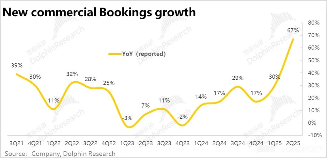 但是与 Azure 近期不佳的表现和指引透露出的信号完全不同,业绩的领先指标反映出的却是相当乐观的信号。首先,新签企业合同金额增速本季同比大涨了 67%,是海豚投研跟踪的历史数据以来的最高值。