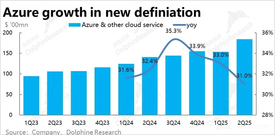 1、 Azure 再提速预期幻灭:Azure 在新口径下本季的同比和恒定汇率下增速都为 31%。较上季度环比下降 2pct。虽然位于公司先前指引 31%~32% 的增速区间的下限,看起来勉强达标。