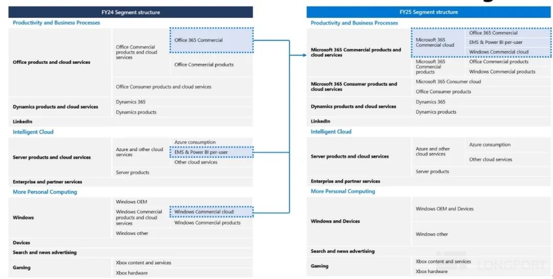 上季度财报后,微软官宣了将在 25 财年开始对财报披露的部门结构做出不小的调整,调整的思路就是把面向企业的微软 365 服务项目(除 to B 的 office 365 之外,还有 windows 365 和网络安全 365)全部调到了以 Office 365 的生产力与流程的收入大项当中(PBP)。在上次业绩点评中,我们已有解读,就不再重复浪费笔墨。下图简要概括了此次的调整,供大家参考。